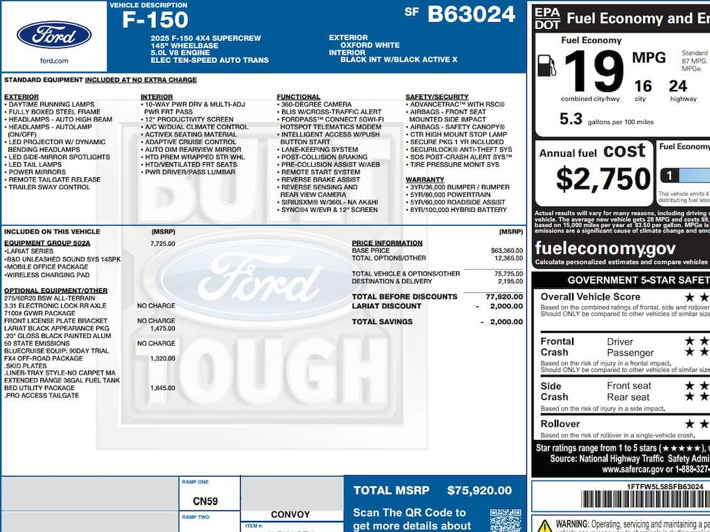 Navigation, Heated Driver Seat, Cooled Driver Seat, Back-Up Camera, Satellite Radio Ford LARIAT with Oxford White exterior and Black interior features a 8 Cylinder Engine with 400 HP at 6000 RPM*.