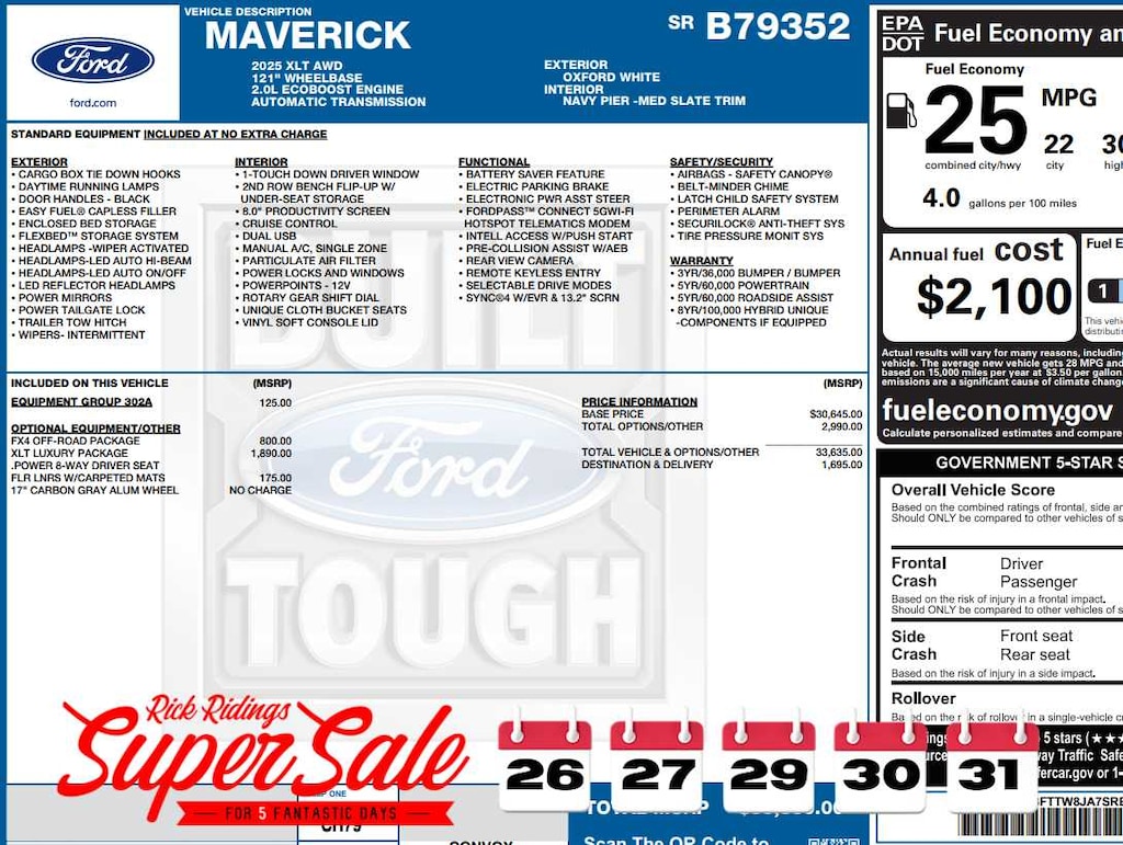 Remote Start System, Soft Vinyl Wrapped Heated Steering Wheel, 400W Inverter w/USB Console Rear, Cab and bed includes cubby cover, Heated Mirror w/Painted Black Skull Caps, Heated Seats, 8-way power driver and 6-way manual passenger seats, LED Box Lighting, FX4 off-road box decal (replaces tailgate AWD badge), off-road screen in instrument cluster and rotary gear shift dial which includes select drive modes: slippery, ECO, normal, sport, sand, tow/haul and off-road, Hill Descent Control, Conventional 17 Spare Tire (215/70R17), Skid Plates, Wheels: 17 Unique Ebony Painted Aluminum, Exposed Front Tow Hooks, Upgraded Cooling Fan, Higher Capacity Radiator, Tires: 17 Automatic Transmission, Performance Suspension, Engine: 2.0L EcoBoost, 3.63 Axle Ratio, Transmission: 8-Speed Automatic.