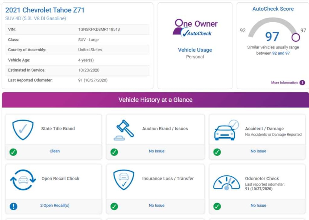 AutoCheck One Owner Was $47,990. This Tahoe is priced $1,300 below Kelley Blue Book.