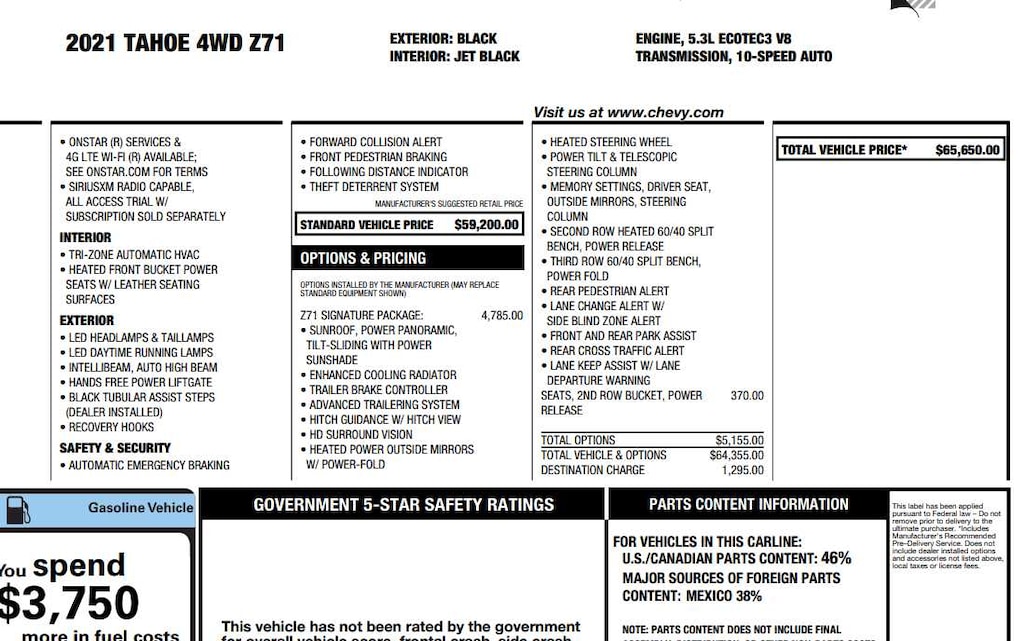 Z71 SIGNATURE PACKAGE: includes (WPL) Luxury Package content, (C3U) Panoramic power sunroof and (NHT) Max Trailering Package, includes (WPD) Driver Alert Package content, (UV2) HD Surround Vision, (UKK) Rear Pedestrian Alert, (A45) memory settings, (DXR) outside heated power-adjustable, power-folding, body-color mirrors with driver-side auto-dimming and integrated turn signal indicators, (N38) power tilt and telescopic steering column, (KI3) automatic heated steering wheel, (KA6) second row outboard heated seats, (ATT) second row power 60/40 split-folding bench seats and (AS8) third row power 60/40 split-folding bench seats, SEATS, SECOND ROW BUCKET, POWER RELEASE, AM/FM stereo, Bluetooth® audio streaming for 2 active devices, Apple CarPlay® and Android Auto® capable, enhanced voice recognition, in-vehicle apps, cloud connected personalization for select infotainment and vehicle settings. Subscription required for enhanced and connected services after trial period. (STD), with Dynamic Fuel Management, Direct Injection and Variable Valve Timing, includes aluminum block construction (355 hp [265 kW] @ 5600 rpm, 383 lb-ft of torque [518 Nm] @ 4100 rpm) (STD), electronically controlled with overdrive, includes Traction Select System including tow/haul (Most vehicles built on or after 6-7-2021 with a V8 engine will have (NSS) Not Equipped with Automatic Stop/Start, which removes Automatic Stop/Start, Engine control stop/start disable button and its content.) (STD), includes (UHX) Lane Keep Assist with Lane Departure Warning, (UKC) Lane Change Alert with Side Blind Zone Alert, (UFG) Rear Cross Traffic Alert and (UD5) Front and Rear Park Assist.