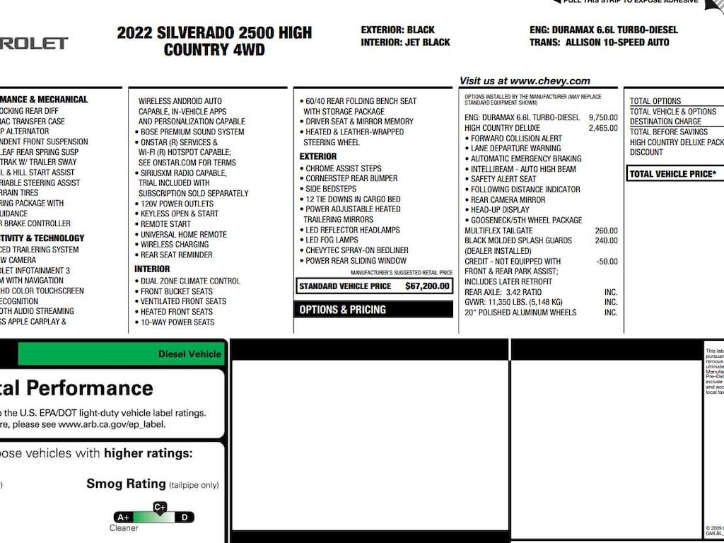 ENGINE, DURAMAX 6.6L TURBO-DIESEL V8 B20-Diesel compatible, (445 hp [332 kW] @ 2800 rpm, 910 lb-ft of torque [1220 Nm] @ 1600 rpm), TECHNOLOGY PACKAGE includes (DRZ) Rear Camera Mirror and (UV6) 15 Diagonal Head-Up Display, SAFETY PACKAGE II includes (UEU) Forward Collision Alert, (UFL) Lane Departure Warning, (UHY) Automatic Emergency Braking, (TQ5) IntelliBeam headlamps, (UE4) Following Distance Indicator and (HS1) Safety Alert Seat, TAILGATE, MULTI-FLEX with six functional load/access features, NOTE: Auto release can be disabled if ball hitch is installed. See Owners manual for details, AUDIO SYSTEM, CHEVROLET INFOTAINMENT 3 PREMIUM SYSTEM WITH CONNECTED NAVIGATION 8 diagonal HD color touchscreen, AM/FM stereo, Bluetooth® audio streaming for 2 active devices, wireless Apple CarPlay® and Android Auto® capable, enhanced voice recognition, additional memory for in-vehicle apps, cloud connected personalization for select infotainment and vehicle settings. Subscription required for enhanced and connected services after trial period. (STD) (Includes (PZ8) High Guidance with Hitch View.), SEATS, HEATED SECOND ROW OUTBOARD SEATS (Standard on models built before 7-26-2021. Certain vehicles built on or after 7-26-2021 will include (RGJ) Not Equipped with Heated Second Row Outboard Seats, which removes (KA6) Heated Second Row Outboard Seats. See dealer for details.), TRANSMISSION, ALLISON 10-SPEED AUTOMATIC.