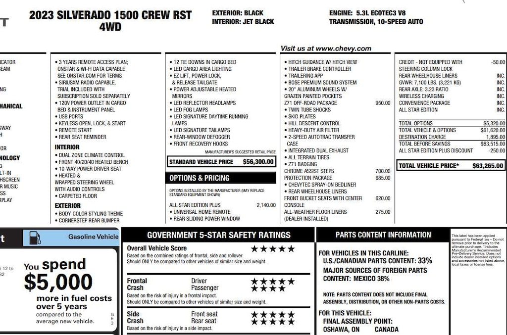 (355 hp [265 kW] @ 5600 rpm, 383 lb-ft of torque [518 Nm] @ 4100 rpm); featuring available Dynamic Fuel Management that enables the engine to operate in 17 different patterns between 2 and 8 cylinders, depending on demand, to optimize power delivery and efficiency, includes (UG1) Universal Home Remote, (A48) rear sliding power window, (PZ8) Hitch Guidance with Hitch View, (JL1) Trailer brake controller and (UET) Trailering App Includes (UQA) Bose Premium Sound System.), includes (Z71) Off-Road suspension, (JHD) Hill Descent Control, (NZZ) skid plates and (K47) heavy-duty air filter Includes Z71 hard badge, (N10) dual exhaust, (RCV) 18" bright silver painted wheels, (XCK) 265/65R18 all-terrain, blackwall tires and (NQH) 2-speed transfer case. ASSIST STEPS, CHROME, WHEEL TO WHEEL, includes (B1J) wheel house liners and (CGN) Chevytec spray-on bedliner, with center console (Includes (EPH) Electronic Transmission Range Selector (console mounted). (includes Z71 logo on front mats), with Google built-in, 13.4" diagonal HD color touchscreen, includes multi-touch display, AM/FM stereo, Bluetooth® streaming audio for music and most phones; featuring wireless Android Auto® and Apple CarPlay® capability for compatible phones, advanced voice recognition, in-vehicle apps, personalized profiles for infotainment and vehicle settings (STD), with Electronic Transmission Range Selector, (ETRS), electronically controlled with overdrive, tow/haul mode and steering column paddle shifters. Includes Cruise Grade Braking and Powertrain Grade Braking.