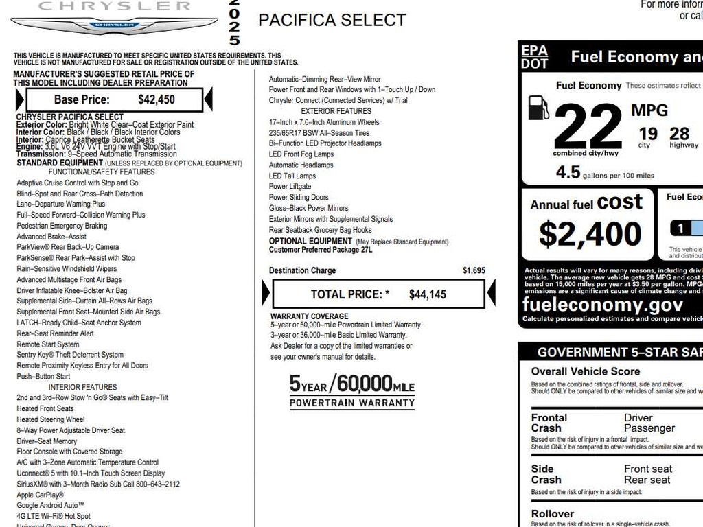 Third Row Seat, Quad Bucket Seats, Power Liftgate, Rear Air, Heated Driver Seat Chrysler Select with Bright White Clearcoat exterior and Black interior features a V6 Cylinder Engine with 287 HP at 6400 RPM*.