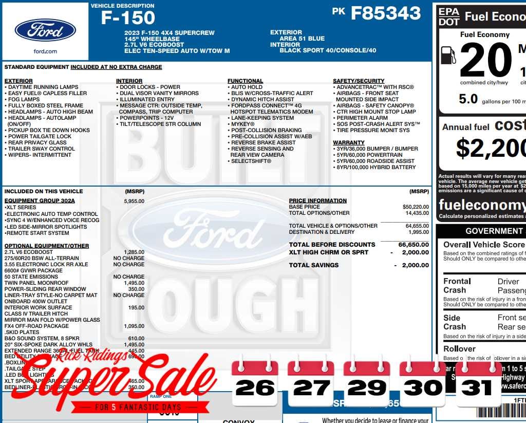 Class IV Trailer Hitch Receiver, towing capability up to TBD lbs, on 3.3L V6 PFDI engine (99B) and 2.7L EcoBoost engine (99P) or up to TBD lbs, on 3.5L EcoBoost engine (998) and 5.0L V8 engine (995), 7/4-pin connector, class IV trailer hitch receiver, smart trailer tow connector ( BLIS w/trailer tow coverage where BLIS is available), XLT Chrome Appearance Package, lower grille trim, Chrome Single-Tip Exhaust, Tires: 275/65R18 BSW Automatic Transmission, Chrome Door & Tailgate Handles w/Body-Color Bezel, bezel on side doors and black on tailgate, Wheels: 18 Chrome-Like PVD, 2-Bar Style Grille w/Chrome 2 Minor Bars, silver painted surround and black background mesh, Bright Polished Step Bars, Zone Lighting, Intelligent Access w/Push Button Start, approach detection, SecuriCode Drivers Side Keyless-Entry, TWIN PANEL MOONROOF, Tires: 275/60R20 BSW AT, 3.55 Axle Ratio, GVWR: 6,600 lbs Payload Package, BoxLink, 4 premium locking cleats, Zone Lighting, LED Box Lighting, Tailgate Step w/Tailgate Work Surface, HD radio and 8 speakers including subwoofer, ELECTRONIC LOCKING W/3.55 AXLE RATIO, body-color wheellip moldings and unique interior finish, Box Side Decals, Body-Color Door & Tailgate Handles, body-color bezel on side doors and black on tailgate, Tires: 275/65R18 BSW Automatic Transmission, Wheels: 18 6-Spoke Machined Aluminum, gloss black painted pockets, Accent-Color Step Bars, Body-Color Front & Rear Bumpers, body-color front fascia, Black 2-Bar Style Grille w/Black Surround/Accents, PLASTIC DROP-IN BEDLINER, selectable drive modes: normal, ECO, sport, tow/haul, slippery, deep snow/sand and mud/rut (STD).