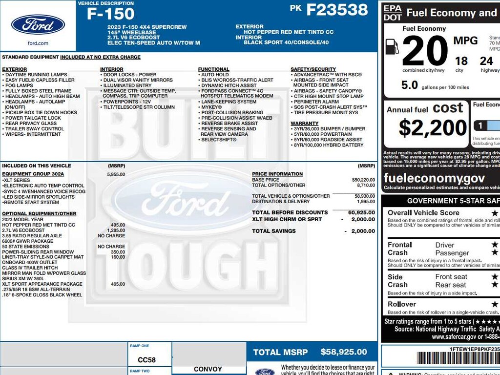 Class IV Trailer Hitch Receiver, towing capability up to TBD lbs, on 3.3L V6 PFDI engine (99B) and 2.7L EcoBoost engine (99P) or up to TBD lbs, on 3.5L EcoBoost engine (998) and 5.0L V8 engine (995), 7/4-pin connector, class IV trailer hitch receiver, smart trailer tow connector ( BLIS w/trailer tow coverage where BLIS is available), XLT Chrome Appearance Package, lower grille trim, Chrome Single-Tip Exhaust, Tires: 275/65R18 BSW Automatic Transmission, Chrome Door & Tailgate Handles w/Body-Color Bezel, bezel on side doors and black on tailgate, Wheels: 18 Chrome-Like PVD, 2-Bar Style Grille w/Chrome 2 Minor Bars, silver painted surround and black background mesh, Bright Polished Step Bars, Zone Lighting, Intelligent Access w/Push Button Start, approach detection, SecuriCode Drivers Side Keyless-Entry, 3.55 Axle Ratio, GVWR: 6,600 lbs Payload Package, body-color wheellip moldings and unique interior finish, Box Side Decals, Body-Color Door & Tailgate Handles, body-color bezel on side doors and black on tailgate, Tires: 275/65R18 BSW Automatic Transmission, Wheels: 18 6-Spoke Machined Aluminum, gloss black painted pockets, Accent-Color Step Bars, Body-Color Front & Rear Bumpers, body-color front fascia, Black 2-Bar Style Grille w/Black Surround/Accents, selectable drive modes: normal, ECO, sport, tow/haul, slippery, deep snow/sand and mud/rut (STD).