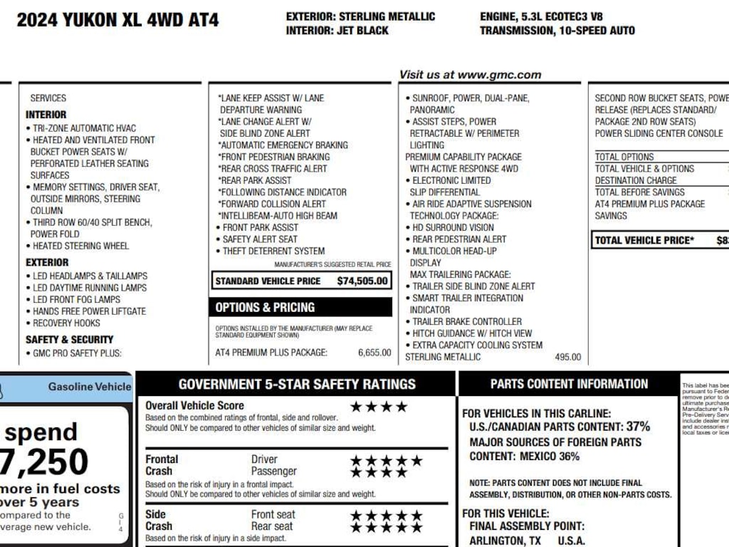 Leather Seats, Third Row Seat, Power Liftgate, Rear Air, Heated Driver Seat GMC AT4 with Sterling Metallic exterior and Jet Black interior features a 8 Cylinder Engine with 355 HP at 5600 RPM*.