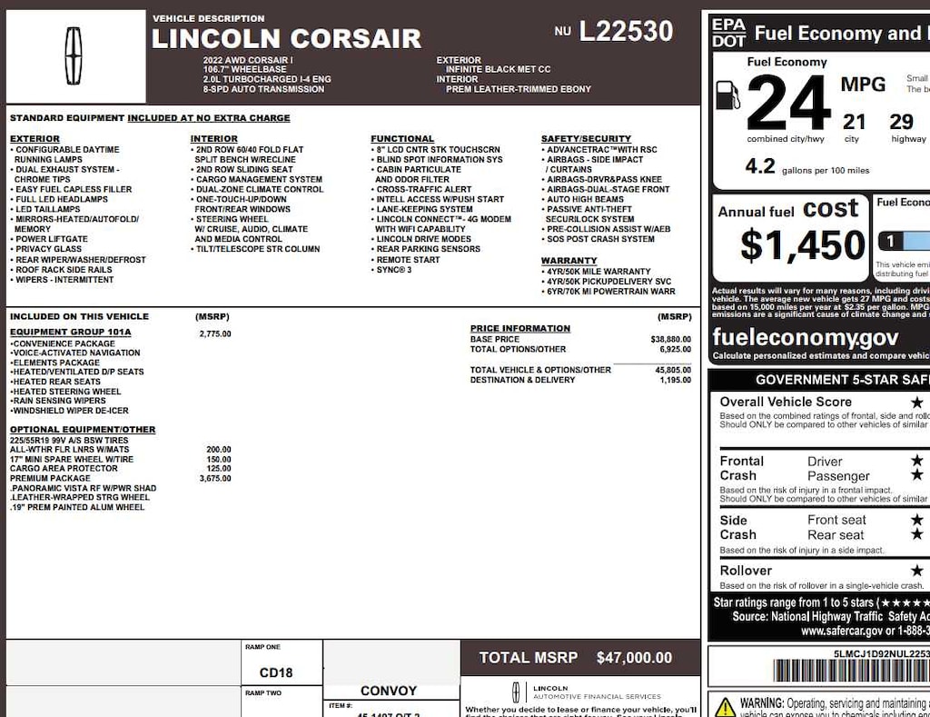 Power Liftgate, Back-Up Camera, Satellite Radio, iPod/MP3 Input, Onboard Communications System. Lincoln Standard with Infinite Black Metallic Clearcoat exterior and Ebony interior features a 4 Cylinder Engine with 250 HP at 5500 RPM*.