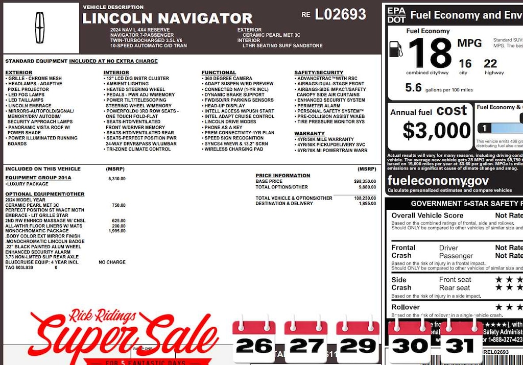 Luxury Package, Perfect Position Seats (30-Way) w/Active Motion, power thigh extender, head restraints and auto heated/ventilated w/memory, Illuminated 1st & 2nd Row Seat Belts, ambient lighting w/LED, Lincoln Lit Star in Grille, Radio: Revel Ultima 3D Audio System w/28 Speakers, subwoofer (featuring QuantumLogic 3D Surround technology), Wheels: 22 Black Aluminum, Body-Color Exterior Mirror Finish, Monochromatic Lincoln Grille, lower body-color bumper accent, Monochromatic Lincoln Badge, 5.8 LCD touchscreen and multimedia audio controls, Front and rear, paddle activation (STD).