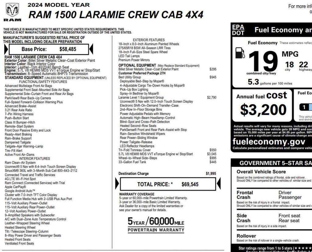 Active Noise Control System, Heavy Duty Engine Cooling, Passive Tuned Mass Damper, GVWR: 7,100 lbs, Dual Rear Exhaust w/Bright Tips, HEMI Badge, 23 Gallon Fuel Tank, 18 Aluminum Spare Wheel, Rear Window Defroster, Blind Spot & Cross Path Detection, Rain Sensitive Windshield Wipers, ParkSense Front/Rear Park Assist w/Stop, Power Adjustable Pedals w/Memory, Rear Power Sliding Window, Front LED Fog Lamps, Heated Second Row Seats, LED Reflector Headlamps, Foam Bottle Insert (Door Trim Panel), Radio: Uconnect 5 Nav w/12.0 Display, Remote Tailgate Release, Auto High Beam Headlamp Control, Electric Shift On Demand Transfer Case, Front Door Accent Lighting, 2nd Row In Floor Storage Bins, Rear Door Accent Lighting, WHEEL TO WHEEL SIDE STEPS, MOPAR Spray In Bedliner, MOPAR 4 Adjustable Cargo Tie-Down Hooks, Pick-Up Box Lighting, TRI-FOLD TONNEAU COVER, TRANSMISSION: 8-SPEED AUTOMATIC (8HP75).
